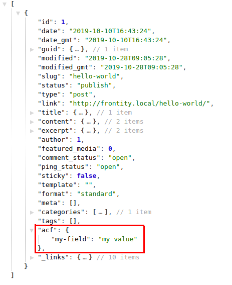 const myField = post.acf["my-field"]; // The ACF info is in the same place.