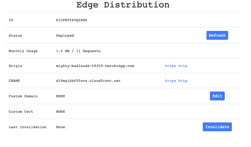 By adding this addon you get automatically a new layer that will be in front of the heroku app. This “layer” is set in CloudFront and the URL of this CloudFront layer is provided by one of the environment variables set by Edge (EDGE_URL )