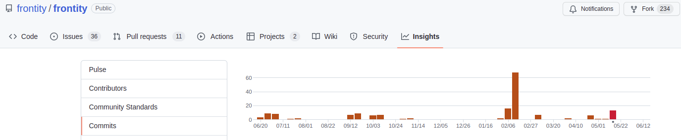 And then, just when the product is mature, it is abandoned to the ‘community’ where there are not a minimal work structure that assure continuity yet. Therefore, nobody knows if it will be maintained or not in the next coming years. The direct consequence of this will be no managers will take the decision of start a new project using an already dead way. The proof is the number of commits in the last year: Frontity commits: