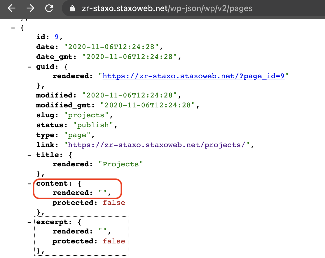 Is projects a custom post type? When I look at the JSON for pages I see that the āprojectsā page has no content: