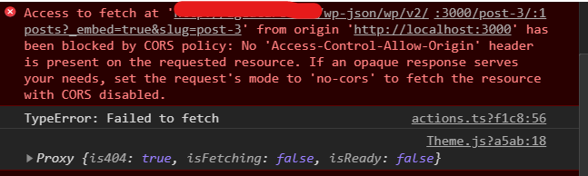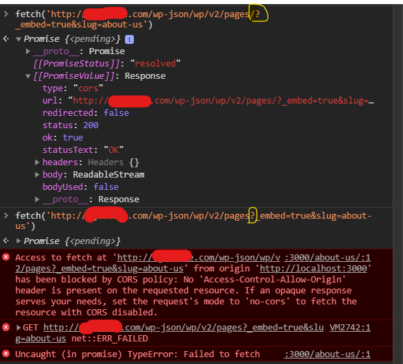 Check the headers of those responses to see if CORS headers are present. As an example, when requesting https://test.frontity.io/wp-json/wp/v2/pages?_embed=true&slug=about-us these are the headers I get: