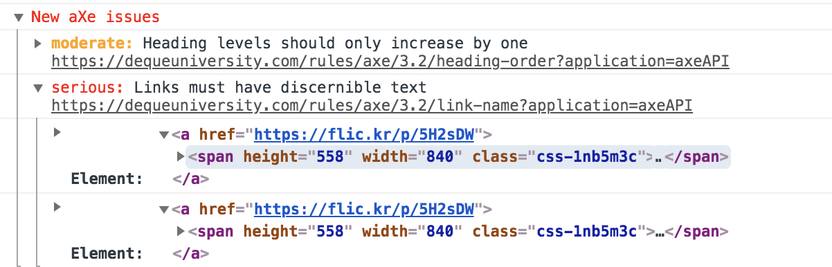 There’s a great Chrome extension that does pretty much the same although it is opt-in (you need to open its tab and click analyze, whereas with react-axe the warnings always appear in the console).