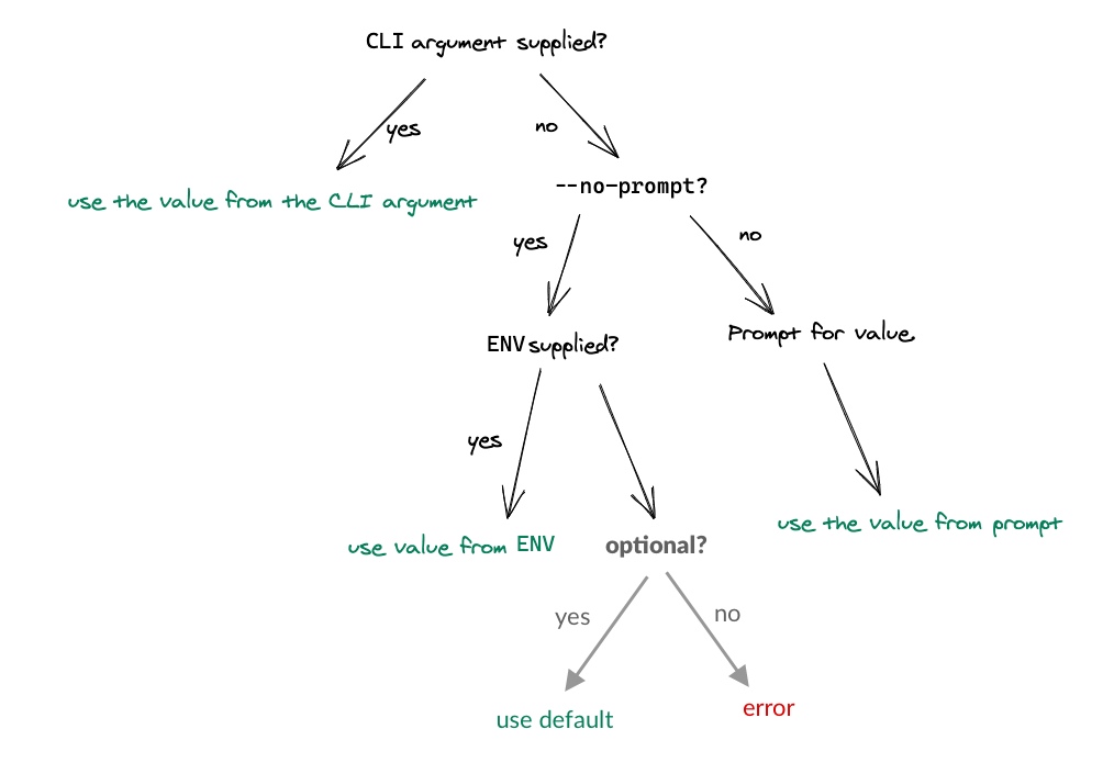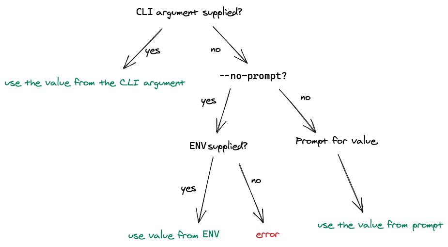 Only in the case of the presence of the arg --no-prompt, the cli won’t prompt for any option and it will execute the command directly.