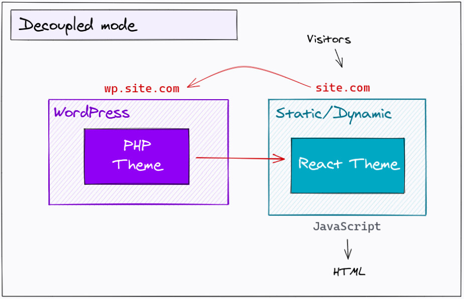 Users have WordPress and Frontity in two different domains. Visitors will arrive to the node.js server, which will communicate with WordPress REST API to get the content needed, and the node.js server will output the HTML.