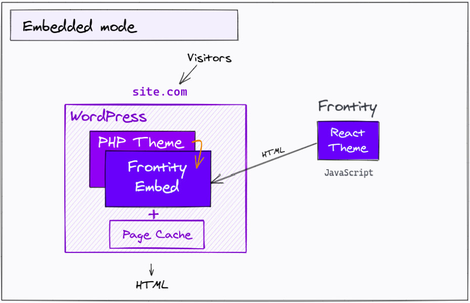 Users have WordPress and Frontity in the same domain. The Frontity plugin will take care of overriding the PHP Theme and do instead an HTTP call to the Frontity server to retrieve the HTML and output that.