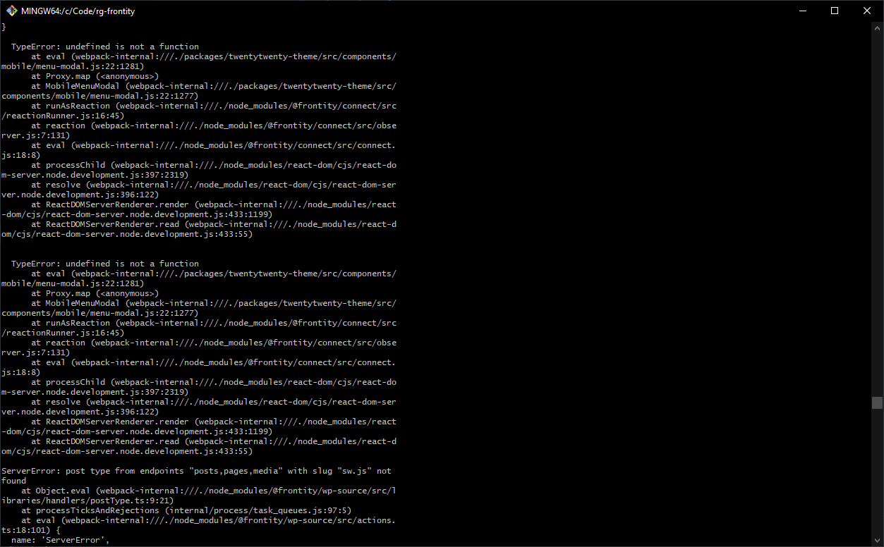 It would be easier for the community (and Frontity team) to help you with your project if you share a repo with your code (so anyone can clone it and debug it locally).