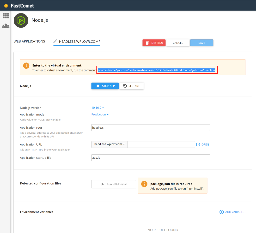 Next I access the Node environment via the command from cpanel (something like): source /home/myaccount/nodevenv/headless/10/bin/activate && cd /home/myaccount/headless