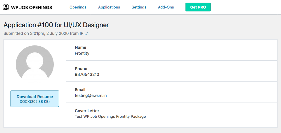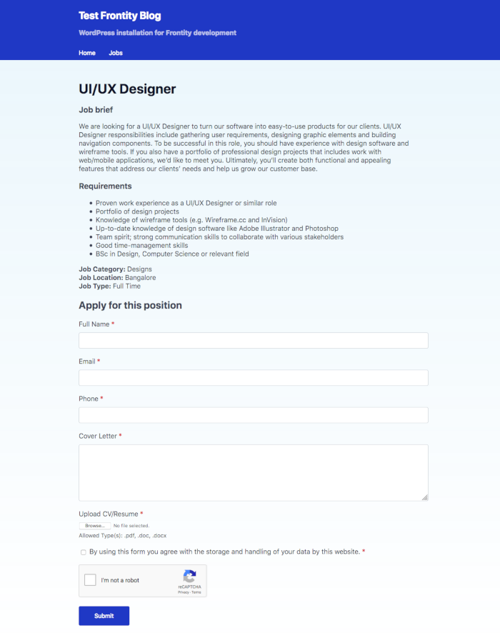 Frontity package for WP Job Openings plugin. This package enables the support for application form provided by the WP Job Openings plugin. All the default fields and the fields supported by Pro version are supported.